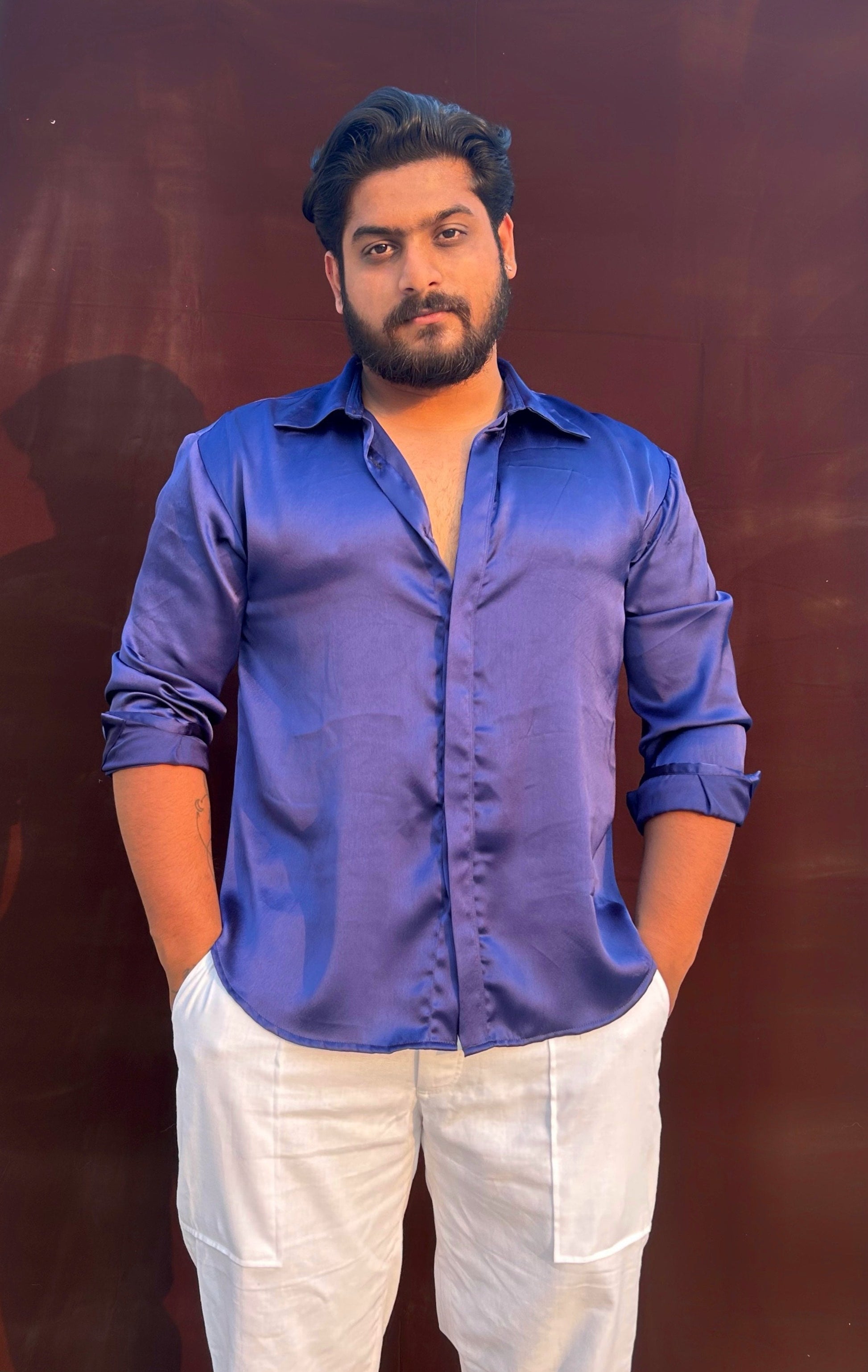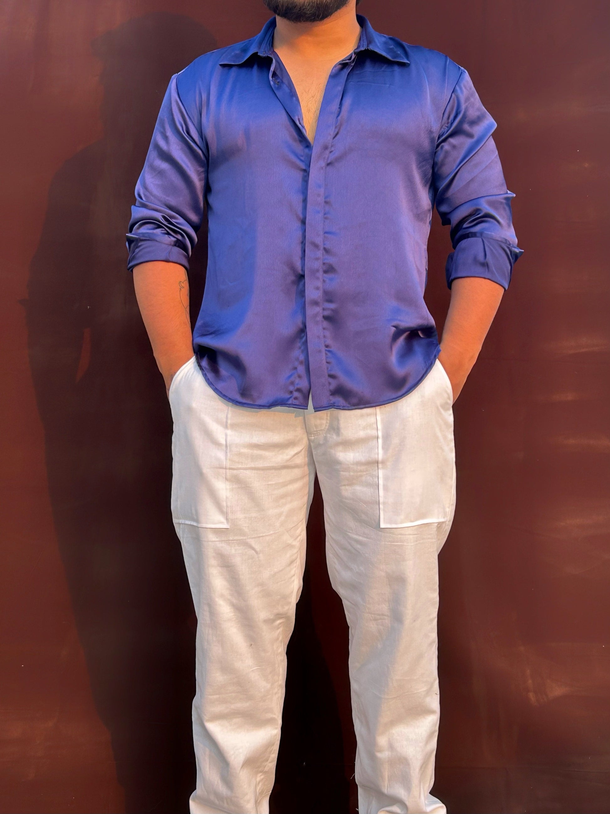 Crafted in smooth satin with a soft drape, this shirt moves with the body, not against it. Relaxed through the torso, polished at the collar, it’s designed for days that slip into nights. Effortless, assured, and endlessly wearable made to be felt before it’s noticed.