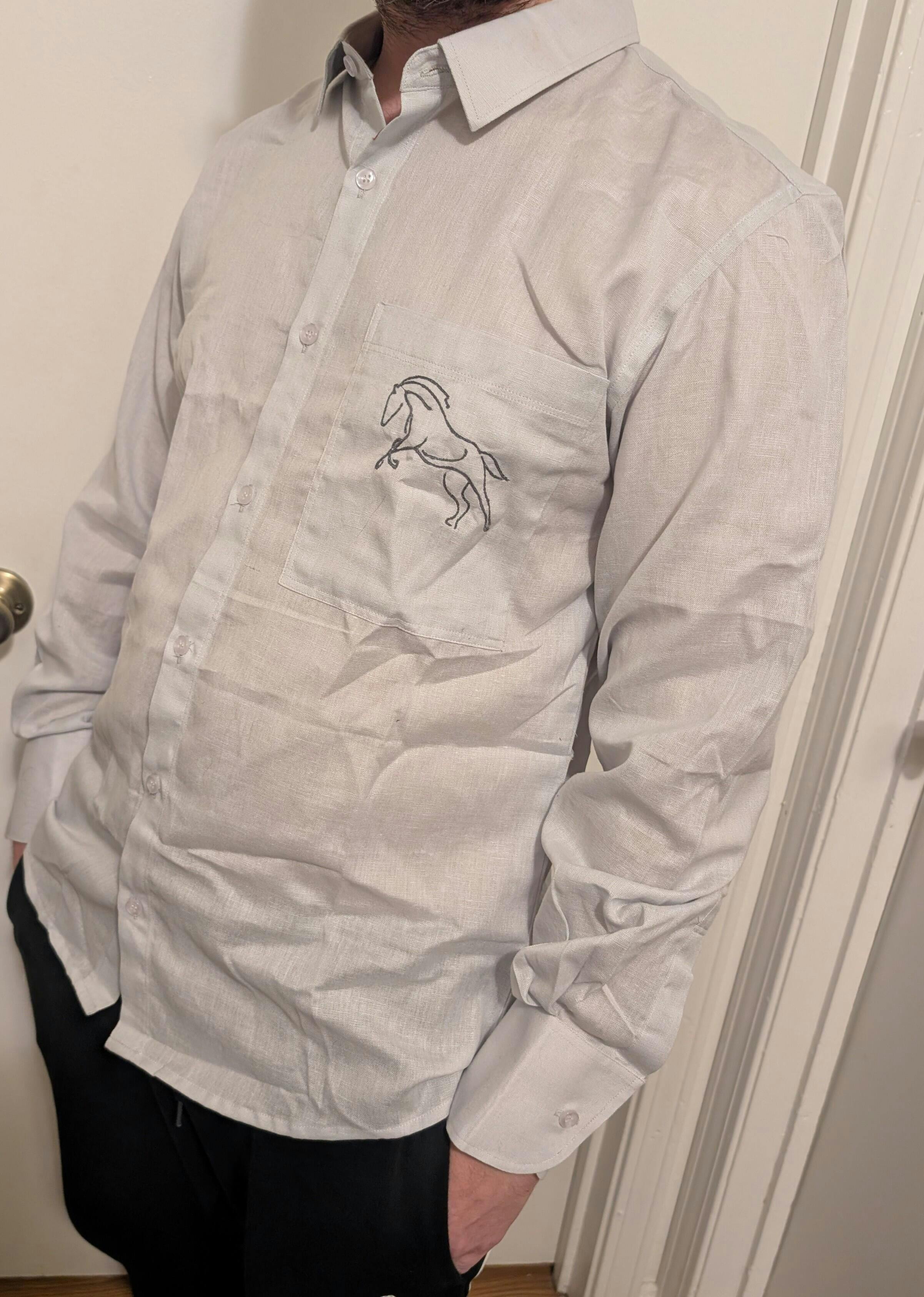 Clean lines. Light ash linen. A single embroidered horse on the pocket. This shirt doesn’t chase attention — it earns it. Made for everyday ease with quiet detail and purposeful simplicity.