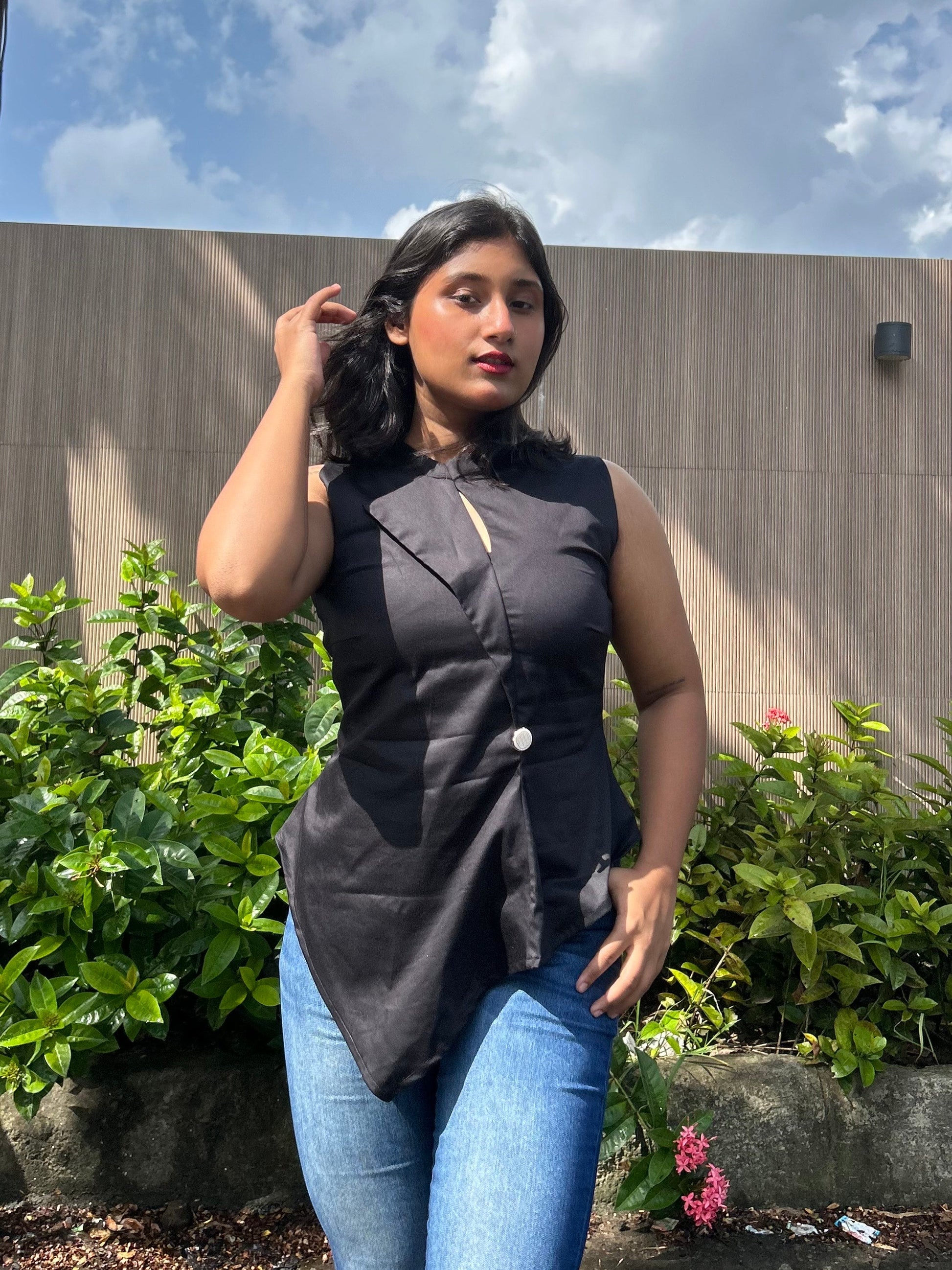It begins with structure, a clean black silhouette, cut sharp like nightfall. A single silver button glints near the waist, anchoring an asymmetric hem that sways like a whisper. The neckline is high, the keyhole just enough. a hint, not a statement. Bold yet quiet, the Midnight Muse Top doesn't ask for attention, it owns it. Made from breathable cotton satin lycra, it moves with you, not against you. Just a top that’s cool, composed, and a little bit mysterious, like midnight itself